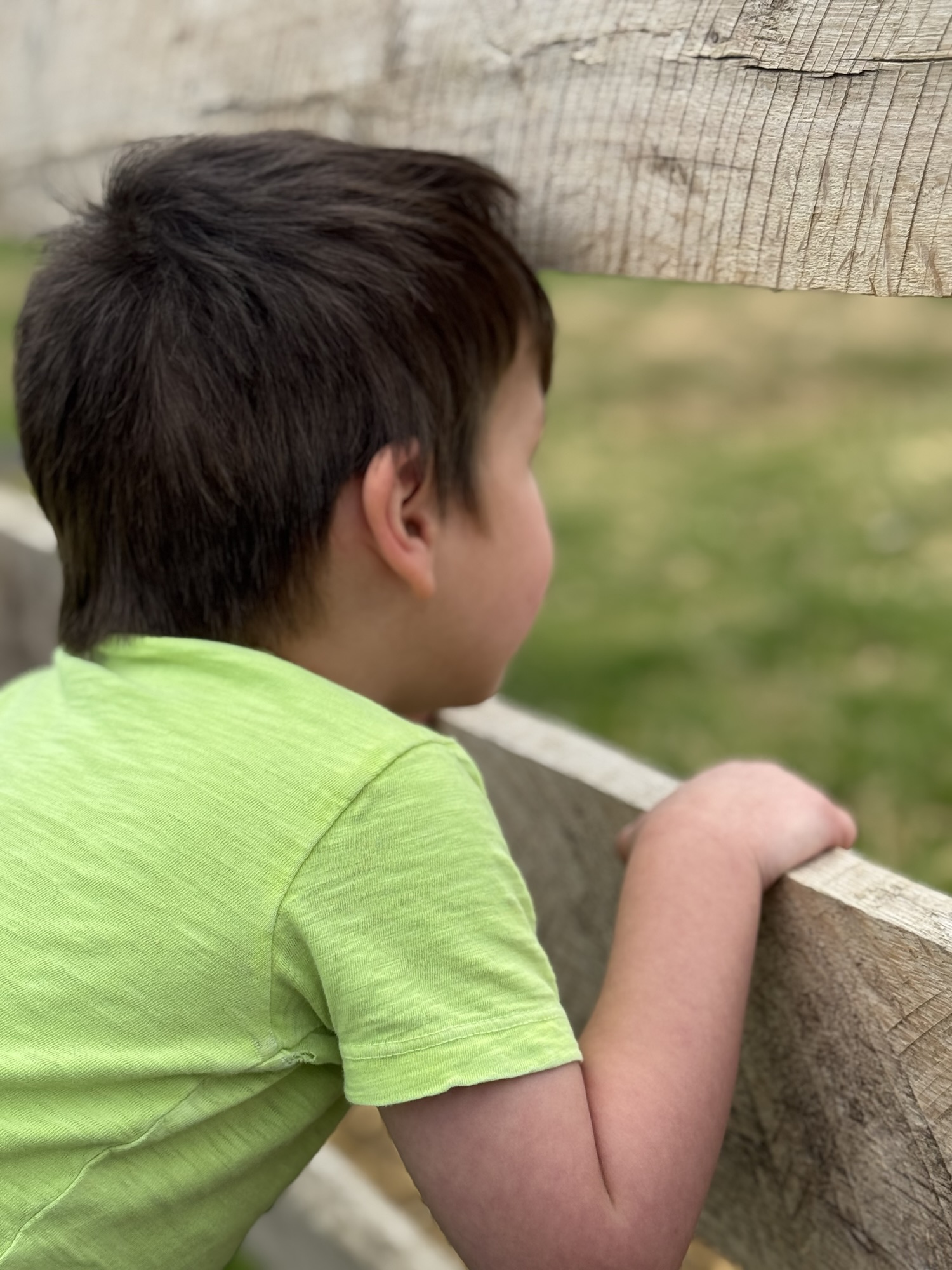 We walked down paths and dirt roads to get there, and K ran ahead, circled back, jumped and tumbled. His natural desire to play had taken hold and now the farm was like a giant playground! When we got to the stables, the horses were just coming out. Their eyes were covered and K was fascinated. Forgetting their size and the smell, he climbed up on the fence to watch them, enthralled. Our whole clan gathered around and his baby sister chuckled from her perch on her dad's back.