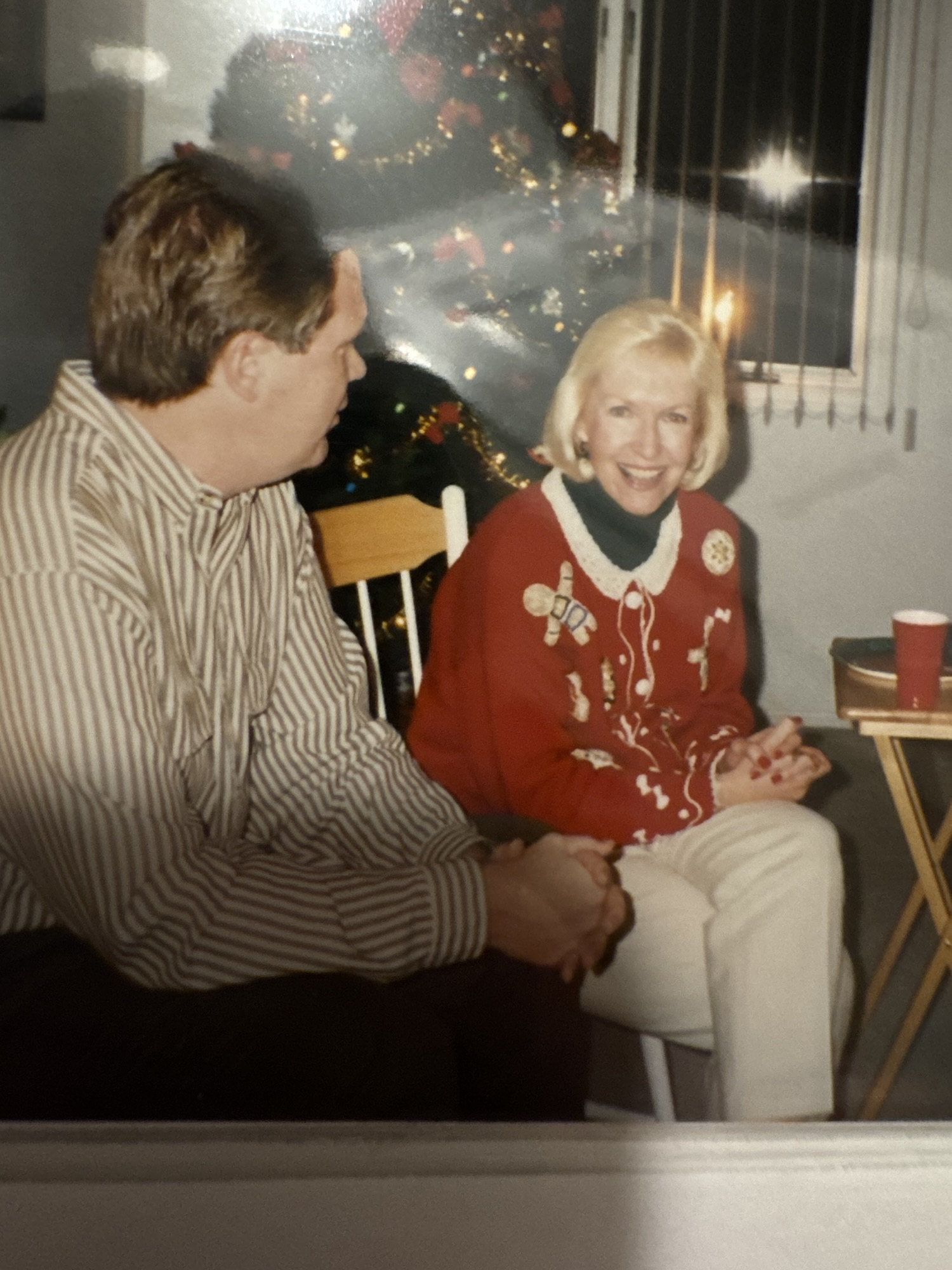 Nancy and her husband at a Christmas party