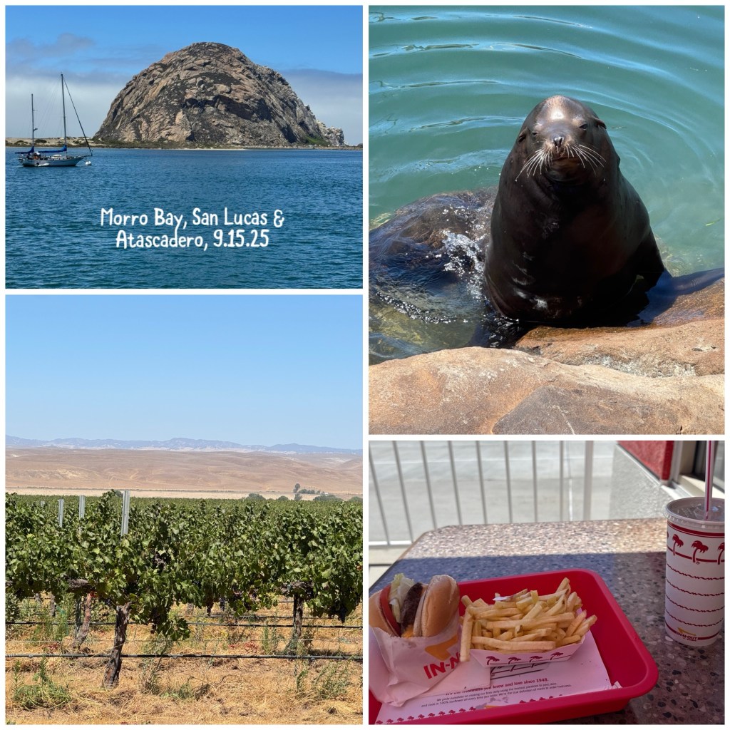 Morro Bay was a vibrant town. The main attraction was Morrow Rock, a 576 foot volcanic plug at the entrance to the bay that can be seen from many vantage points. The name was given by a Portuguese sailor in the 1500s and means crown shaped mount. The friendly sea lion sunning himself made my day! I pulled over in San Lucas to get a shot of one of the many vineyards and stopped for an In-N-Out burger meal from California’s first drive-through restaurant. I excitedly told the kid who waited on me that it was my first time and he came and found me and gave me a sticker! 😂