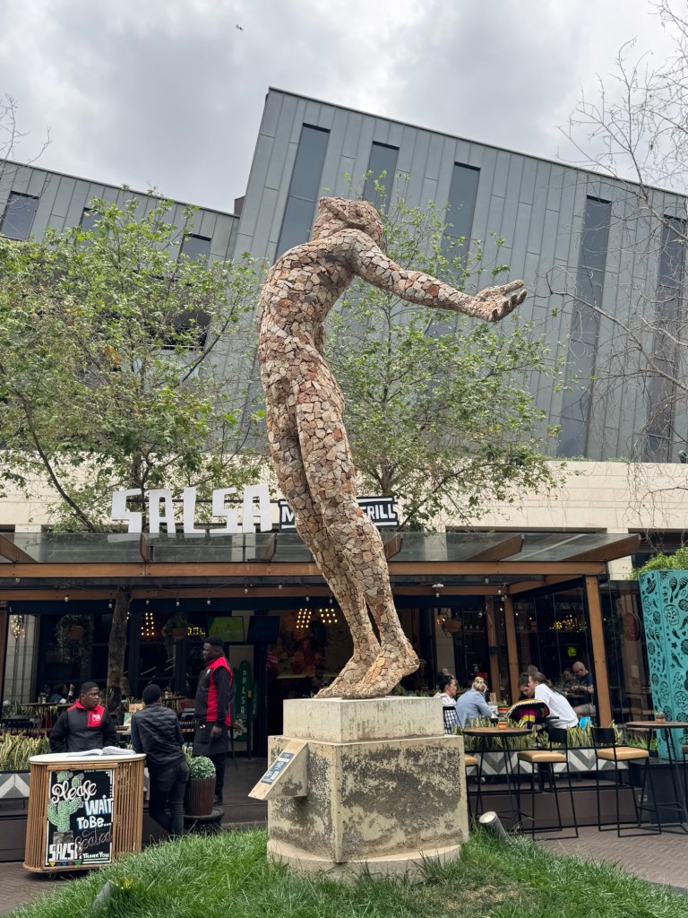 My first stop was the Menlyn Maine Market. This was a large outdoor market with many artisans selling tea, body lotions, sauces, clothes, chocolate, shoes, art and so much more. I bought some jewelry, a watercolor kit, a dark chocolate date bar (healthy!), a sweater and Christmas gifts for the girls. I saw so many other things I would have loved! I had a delicious chai tea latte and enjoyed the sculptures. I stayed for about three hours and my parking cost $.56. I could have had my car washed in the lot for another $.20. At one booth, two young women pounced on me when they heard my accent! They said they practice their “American” accent all the time, though they were too shy to try it for me! I explained about all the different accents around the country, but they mostly knew New York! Finally, one tried it and I said I liked her South African accent better. She told me it’s been voted the sexiest accent in the world. Why mess with that? They were so fun! I loved a unique dress at one stall and the woman was so happy to explain to me how she designs them. They’re one size fits all. She only had a bright green left and I preferred the bright orange or yellow, so she’ll bring more next month. She sold out so quickly today. I panicked when I saw that low carb is a thing here, too, but felt better when I saw the Lucky Bread shop just steps away. I reported both via text to Kristin right away! There’s a place for both of us here! I bought a chai tea latte there and enjoyed it (second best ever) in my Damn Good Coffee cup (by the way, no luck finding a mug…missing my dog mug courtesy of Jaclyn, my Secret Santa, two years ago.