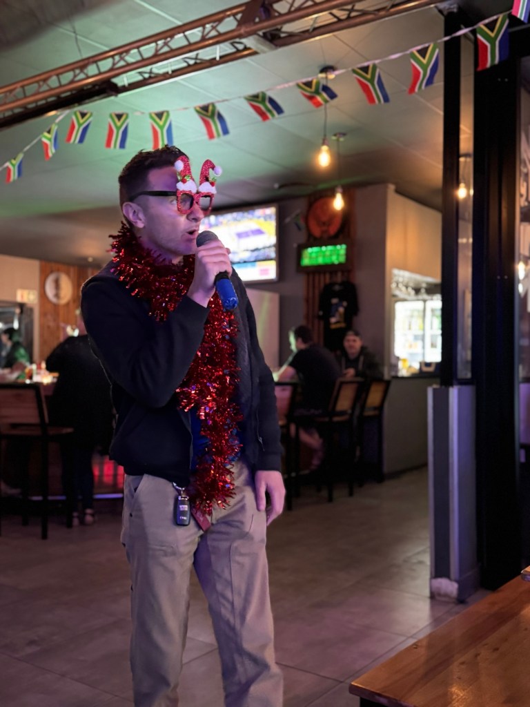 Anyway, it was a Christmas themed one, so I arrived with the various holiday accoutrement that I had picked up for spirit week and each person who sang was adorned in my items. It was a small group, but we sat and ate and drank and played cards and went up front whenever it was our turn. When I say our, I mean their. Each person was so good and I was more convinced that I would not be trying this tonight. Eventually, I had enough liquid courage to do a quartet with the group and it was indeed quite fun! I couldn’t even hear myself, so in my mind I imagined I might actually be okay.