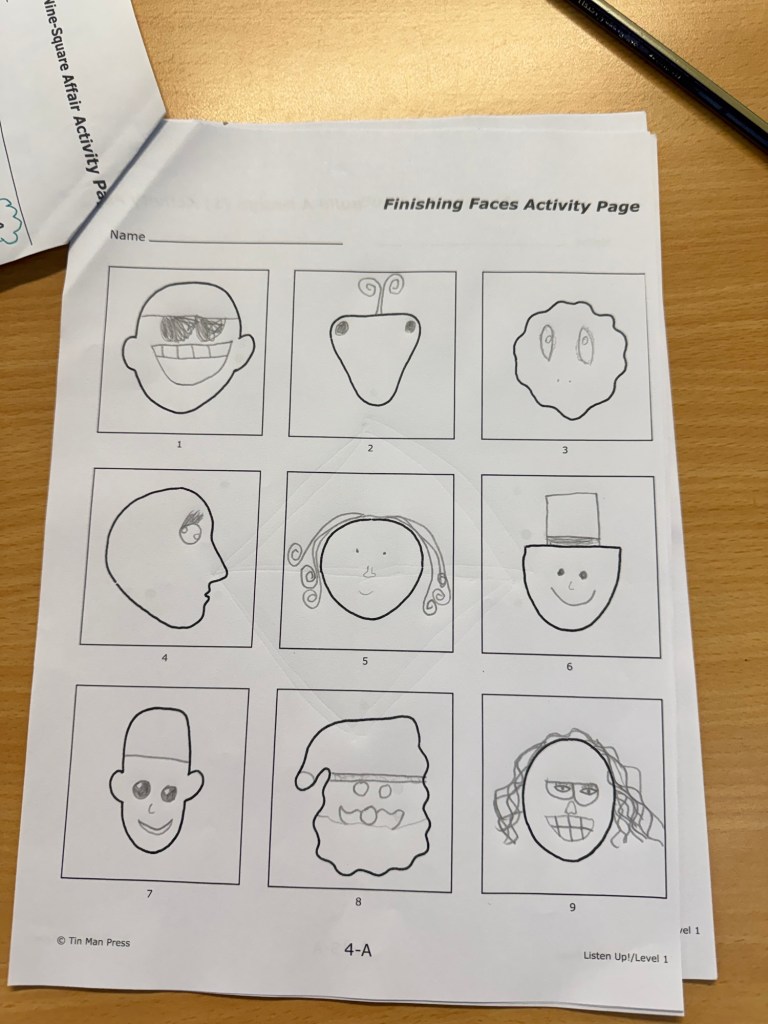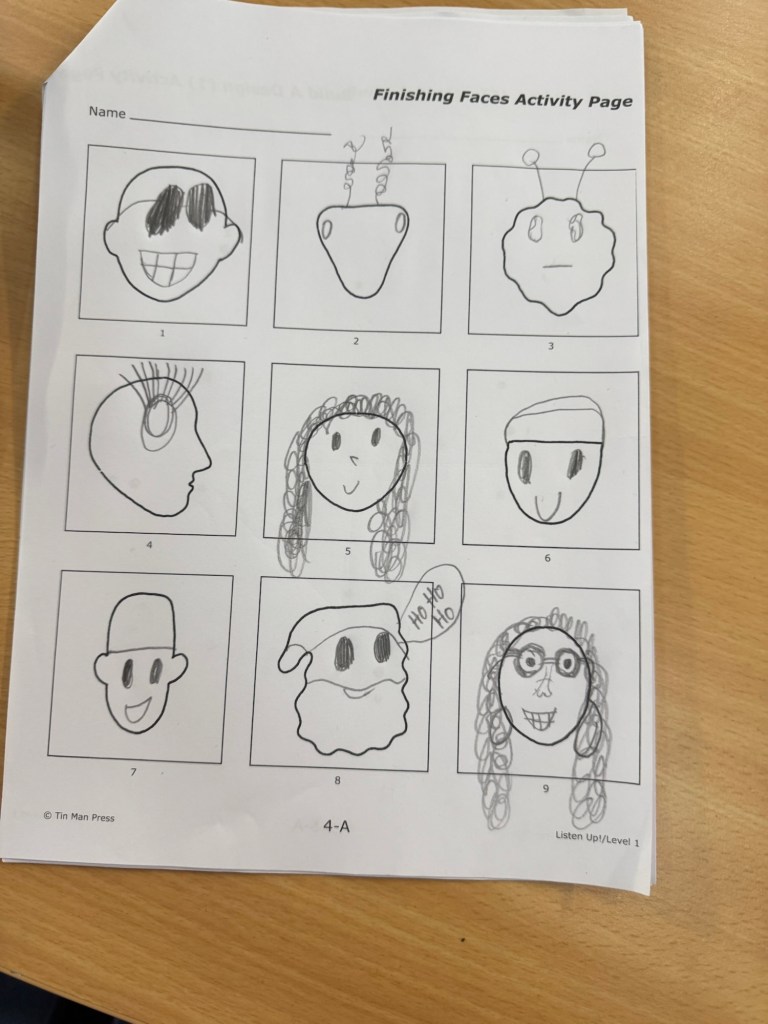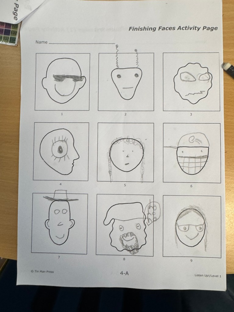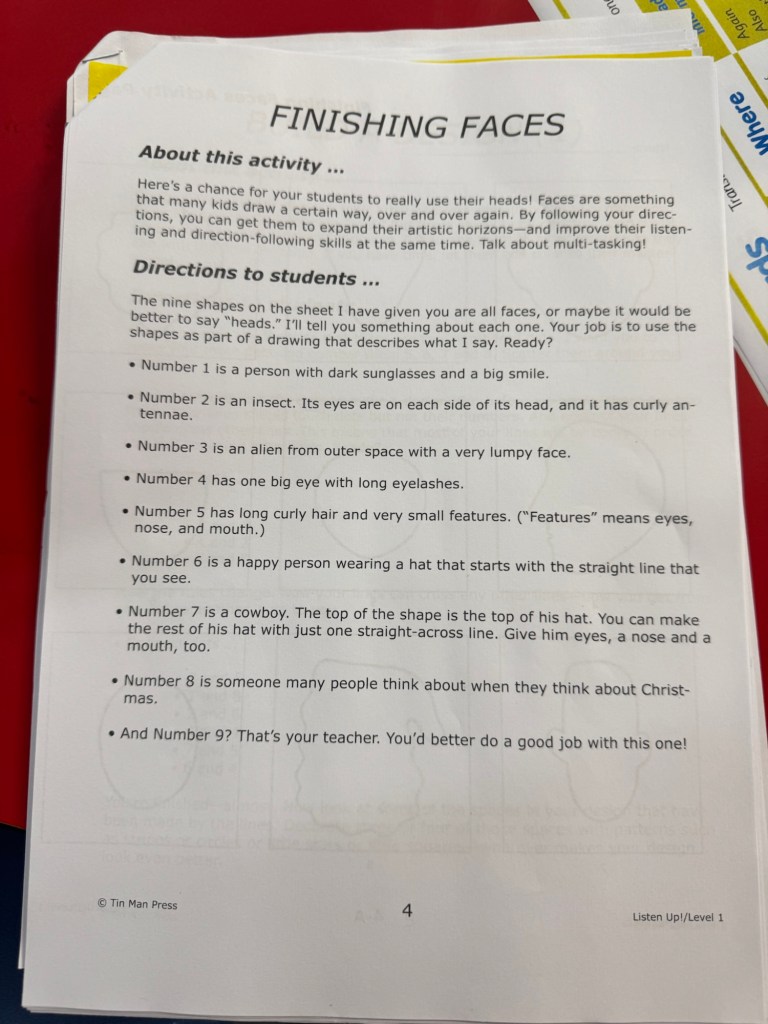 Getting students to listen and follow actions can be one of the frustrating parts of being a teacher and requires constant self reflection to think about your delivery and timing. One solution I have is to do an activity a week from this listening skills packet. I read from a set of directions and only repeat one time. The activities are all fun things for the kids to do. Here are the directions I read and a few student examples! One of the kids said it was so awkward to do number nine. I told him it was not nearly as awkward as being the one everyone was staring at and sketching! Sidenote for teachers: this is from tin man press, which has amazing material that I’ve been using for over a decade, and it is still so relevant. Most of the packets are designed for problem-solving, using creative and critical thinking.