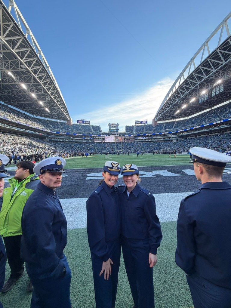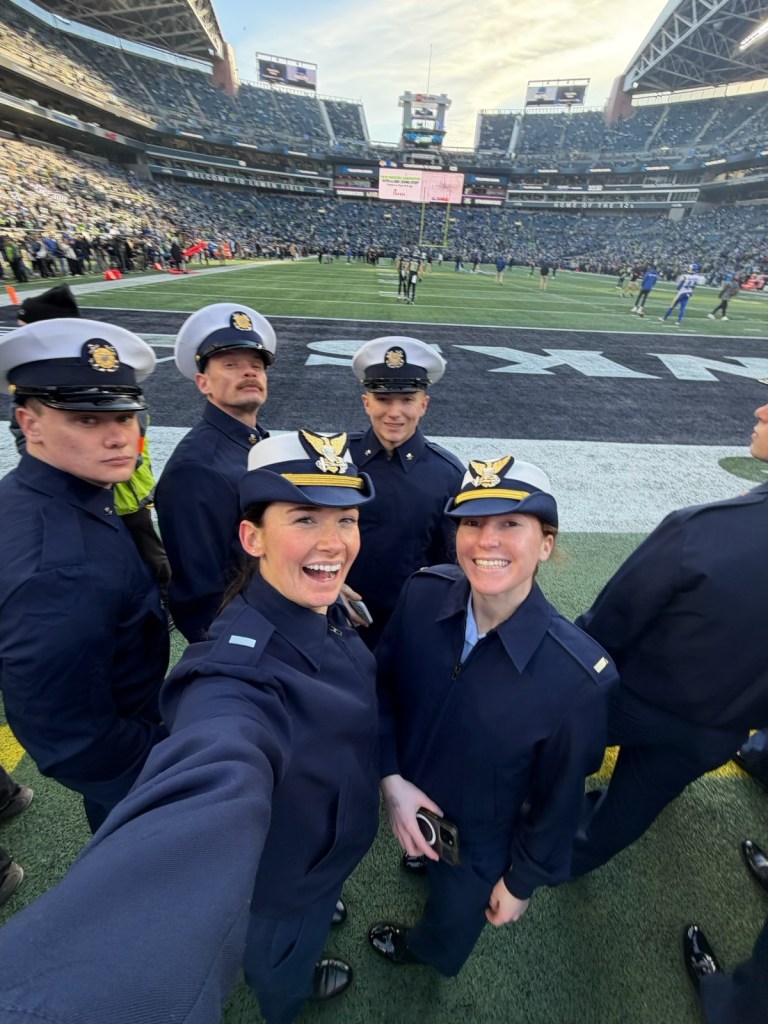 Later that night, I was opening up a box with the pieces of my new dresser, and it slipped out of my hands and fell on my big toe! Very painful! Right on the nail! I did a few rounds of icing, then took it upstairs, piece by piece and assembled it.  G sent me a picture from the Seattle Seahawks game, where her boat got to help spread out the American flag during the National Anthem. The players came over to shake their hands and they got free tickets to the game.