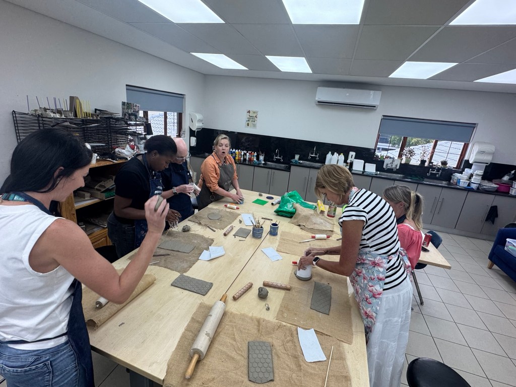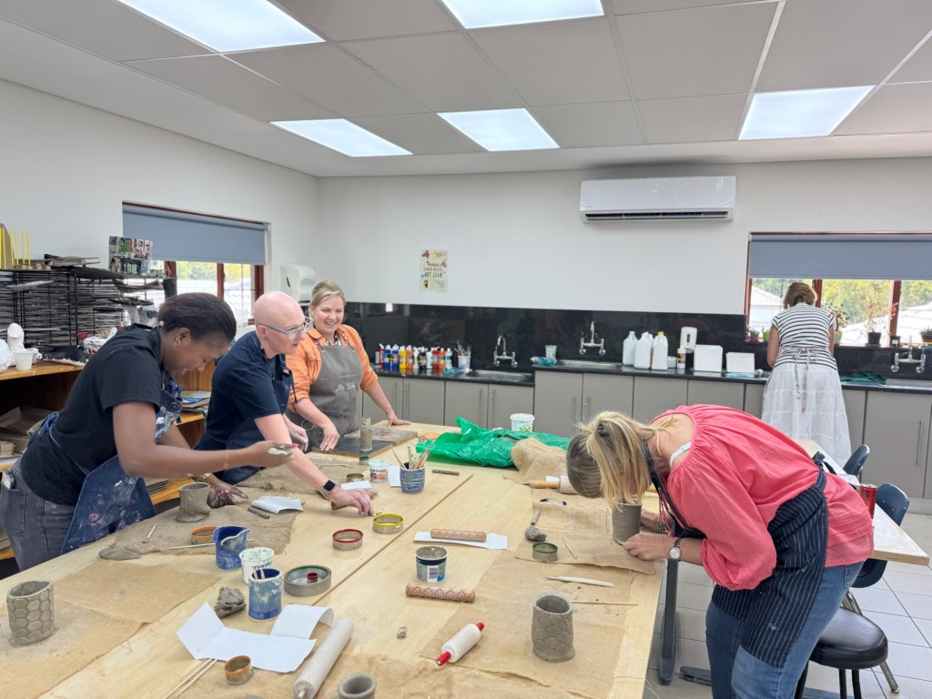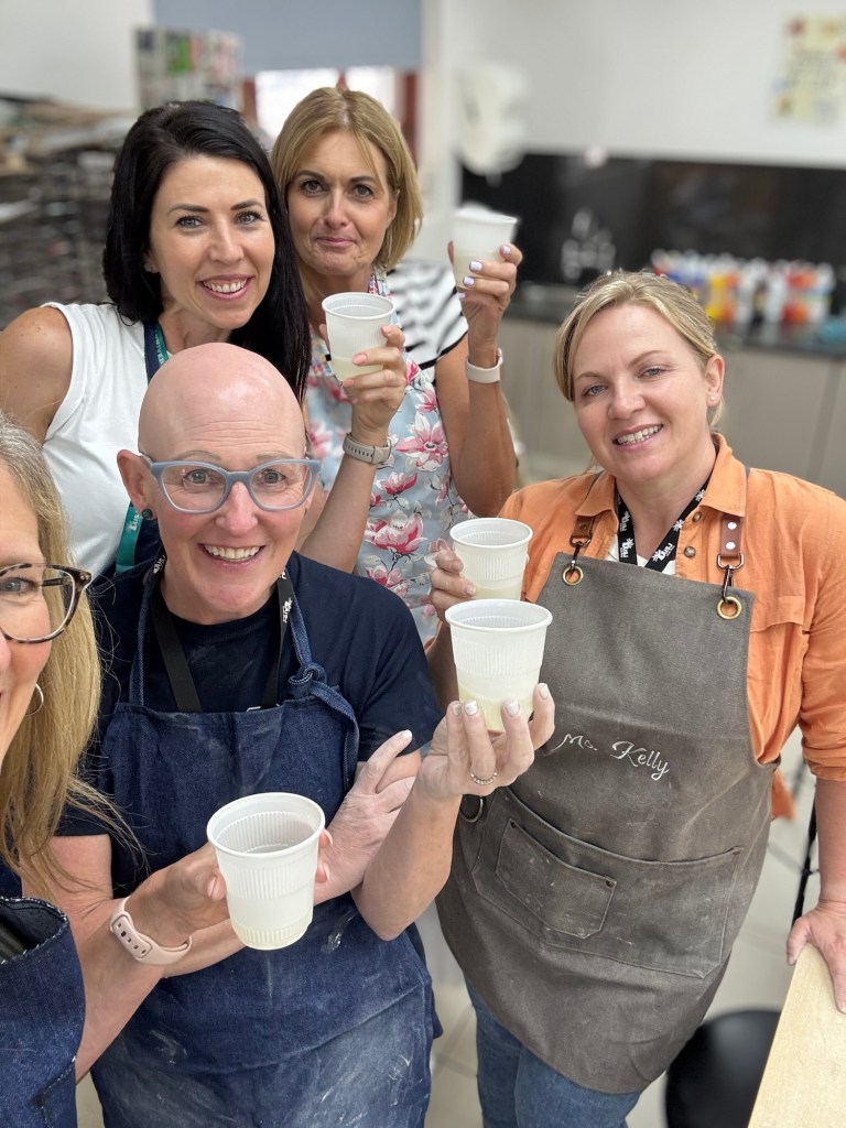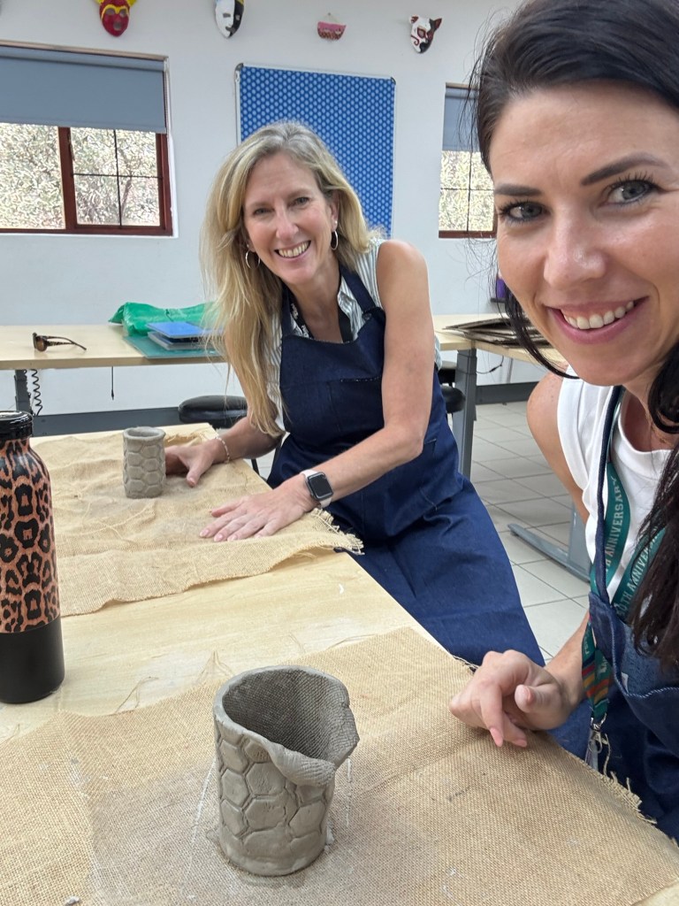 The kids had off on Friday so that we could have professional development. In the afternoon, we got to choose a wellness activity. I chose pottery. We were supposed to make a votive holder, but I’ve been propagating plants like crazy, so I made a little vase. We worked up in the art room with our art teacher. Admin had given us a luncheon that day complete with wine, so we brought the extra up to our work session.