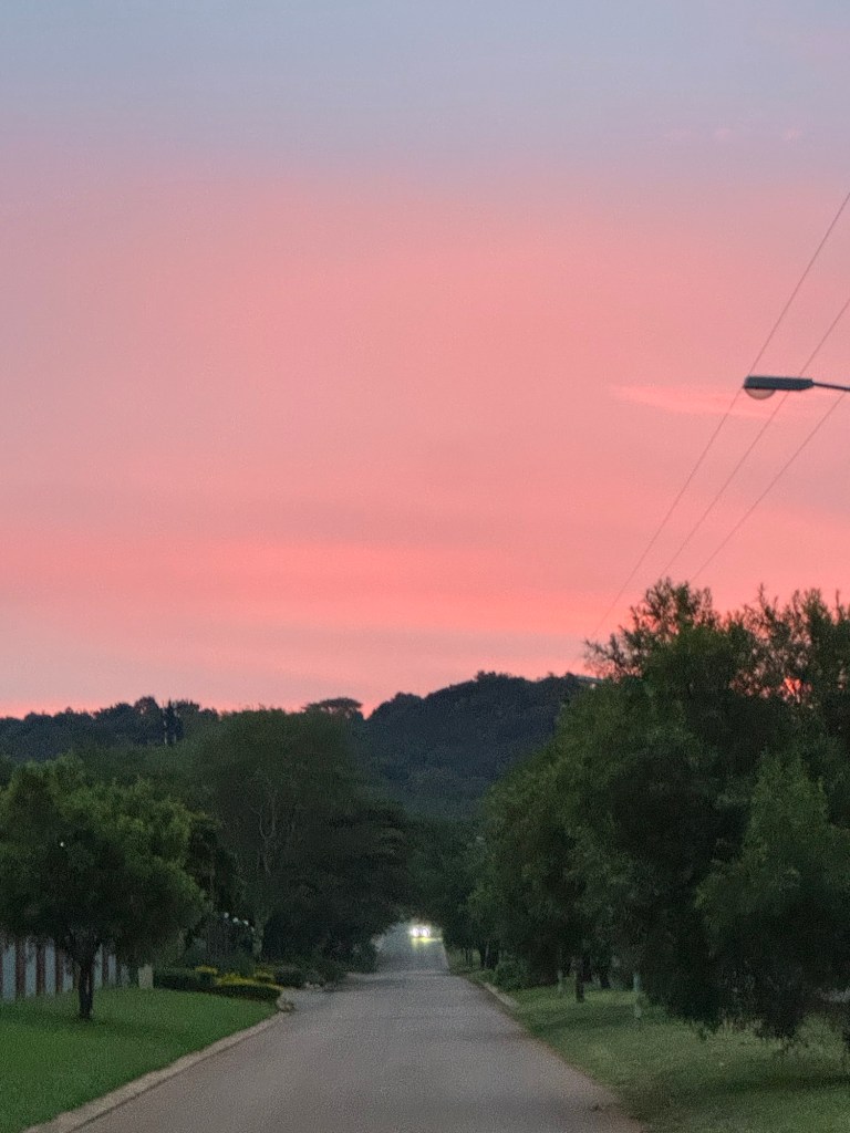 Next, it was off to the salon. I decided to go with a darkening and a gray blending. It was a lovely time, especially the hair wash. Just under three hours and only $57.55, including the tip. In fact, when I said, Please add 20%,” Lelani replied, “You’re not in America anymore.” She put in a R30 tip instead. I enjoyed reading some South African magazines and chatting. I also walked around outside a bit and found beautiful purple flowers growing.