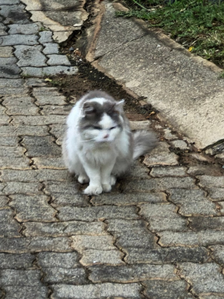 My walk that night had a beautiful sky and some pretty flowers, as well as two kitties. The other did not sit nicely for a picture. I have to laugh at this potted tree in my backyard…