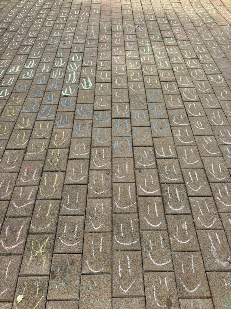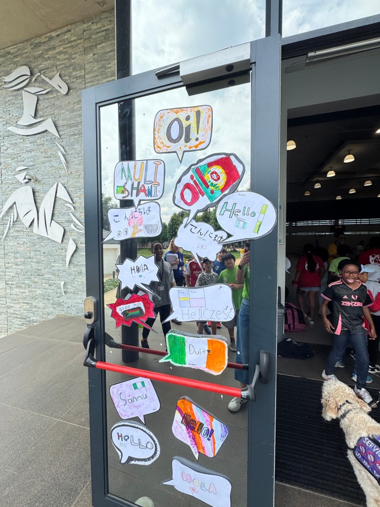 At recess, the 4th and 5th graders covered our sidewalk in chalk smileys. That was a great moment! It was Mother Tongue day, celebrating and encouraging the world’s people to keep their native languages, even while acquiring new ones. The message was powerful and necessary. The kids had decorated the doors with the word hello written in their native language. The assembly included a fun quiz that four members of each “house” competed in.