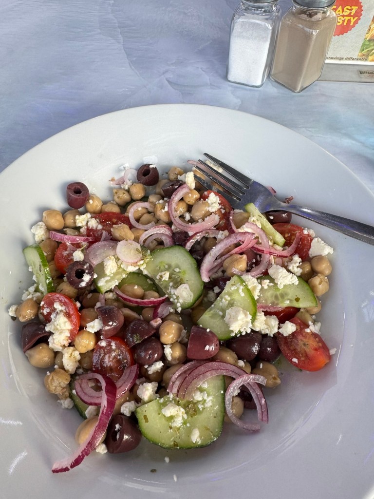 The padel court is next to my gym, so I walked over and got a delicious salad from the cafe there. I relaxed a bit and then tried out a strength training class upstairs. It was crowded and not as strenuous or long as my Les Mills classes, but I missed the camaraderie, accountability and energy of group classes. The instructor was nice and helped me set up when I told him I was new. He had so much energy despite just having taught a kickboxing class for an hour! I was a little light with the weights for the first time until I knew what to expect, but I will definitely go higher next time. There’s a similar class on Mondays, so Eunine and I might start going to that. And maybe Stephanie or Avishkar since they can come for free as my gym buddy. I’ve been eating protein bars since arriving in country, trying to focus on those with less sugar. But not knowing the conversions that well, I really don’t know how I’m doing. I passed on most of the gluten and dairy offerings at the luncheon, but let myself have the feta in tonight’s salad.