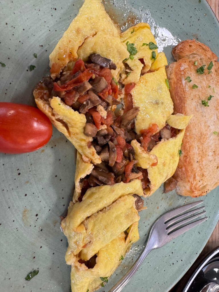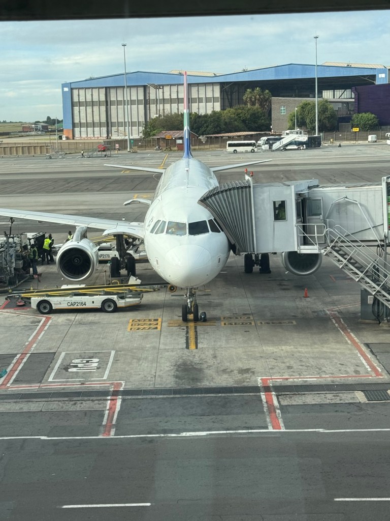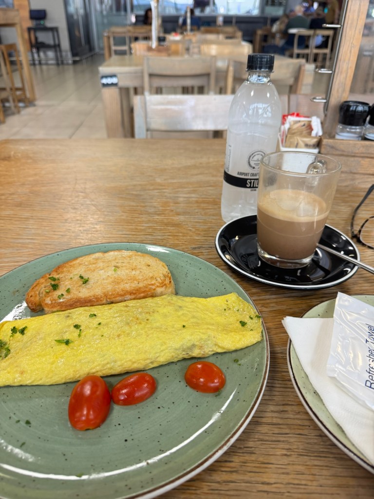My friend Bex picked me up at 5:30 a.m. and took me to the Johannesburg airport. I always like to be there nice and early so I don’t stress, plus the people watching is always excellent and I love to get a cup of tea.I also got breakfast, which was a small, light omelette with delicious fresh ingredients.