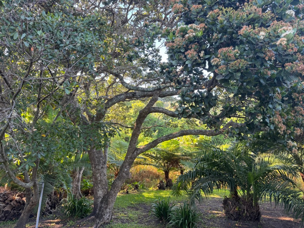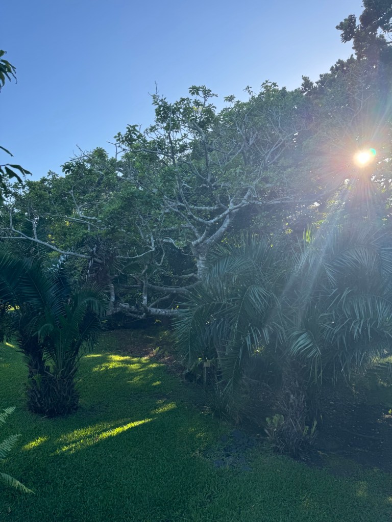 I woke up early this morning and laid in bed listening to the birdsong. The mesh windows were open on both sides of my room allowing for gentle breezes to enter the room and my view was out the back French doors to the deck and beyond to the trees around the lagoon. When I came out, I discovered that Walter had gone up to the deck with the beautiful view of the ocean to meditate and so I took the opportunity to do my stretches on the back deck overlooking the lush surroundings. The sun was peering through in a most whimsical way, turning the leaves and branches into a painting.