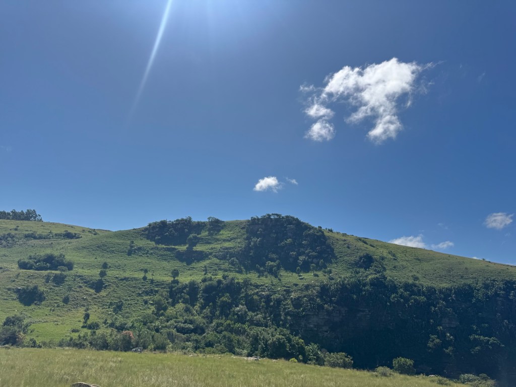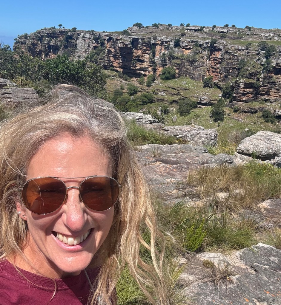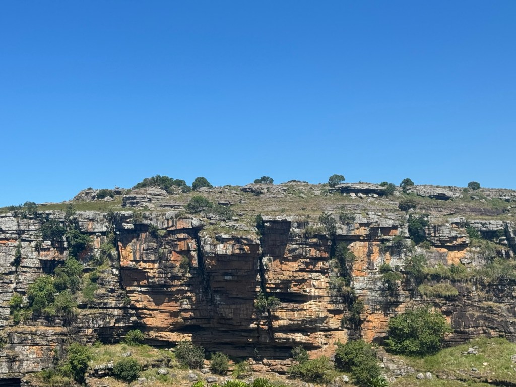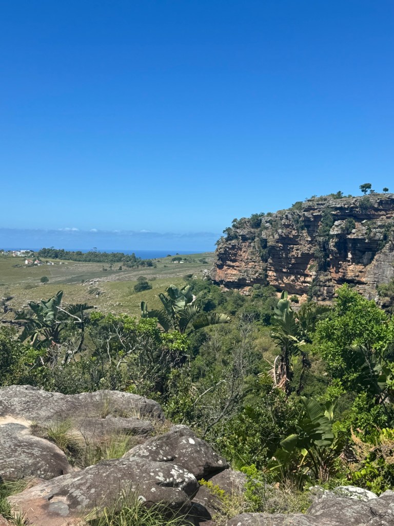 Once we’d had breakfast, we started on today’s adventure, a visit to the Mnyameni Gorge. Although it was not far from where we were staying, it was a long, hard drive but through fascinating land. It took an hour and a half to go 29 miles with little to no traffic. There isn’t a direct route down the coast, so you have to turn sharply inland and then make your way south again. Once you enter the area, the road is no longer paved and has deep divots, large potholes and very rocky terrain. It was slow going and required patience and concentration.