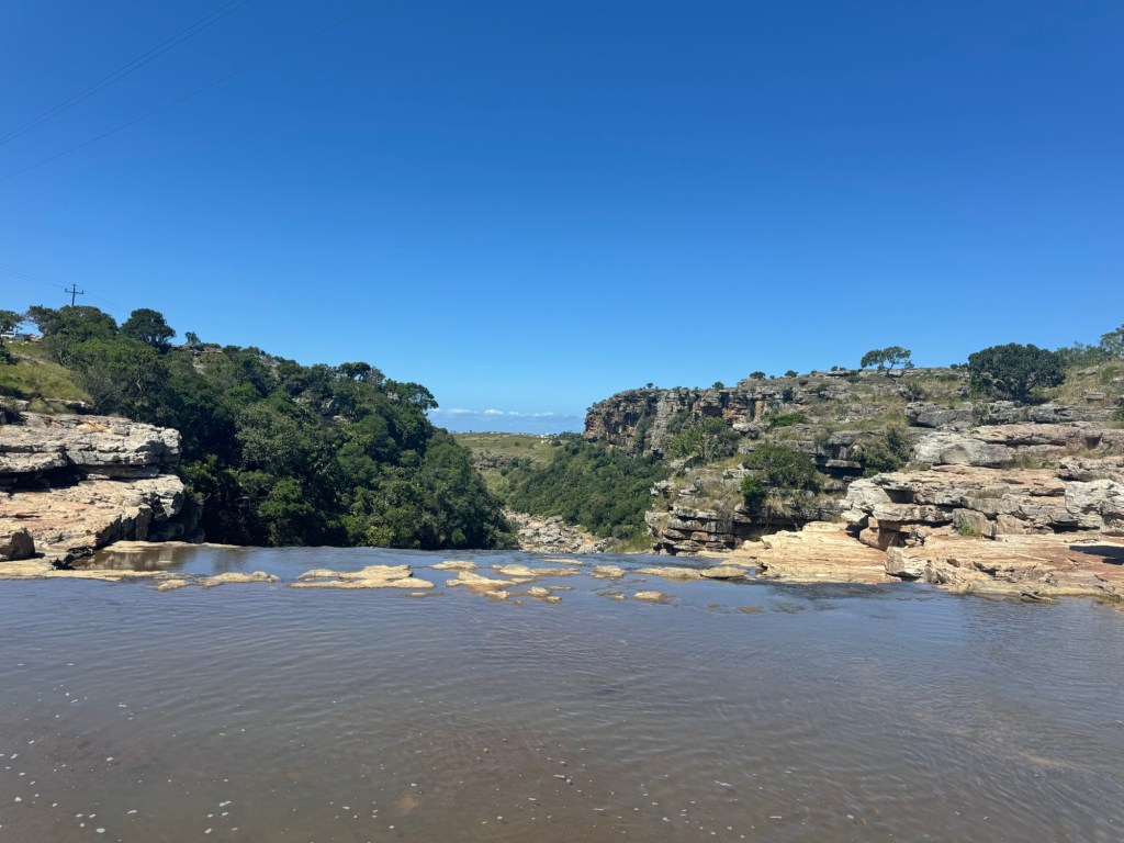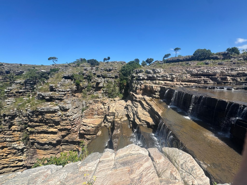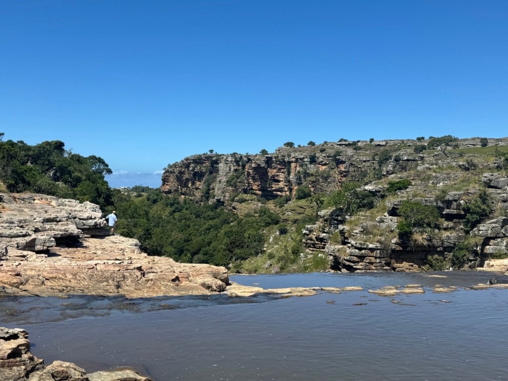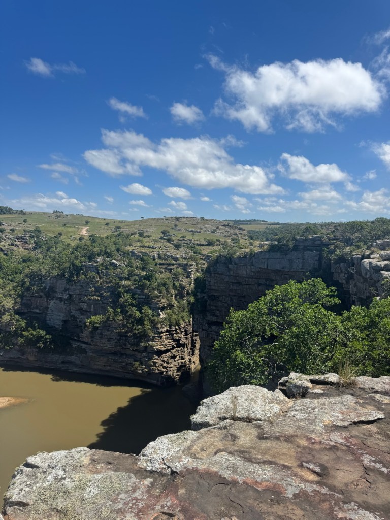 I had bought new hiking boots in Umhlanga, so I was able to break them in on this trip. We finally reached the gorge after an hour’s drive or so down the twisting, turning dirt road leading in. There was no one in sight. There was no entrance fee or park ranger. We just parked on the side of the road and each got out to go explore. The gorge was deep and my fear of heights kicked in quickly. I stood a ways back from the edge, but did my best to capture the vastness. I also walked out across the waterfalls that were a bit lower than usual despite the rain. That gave me a great vantage point.