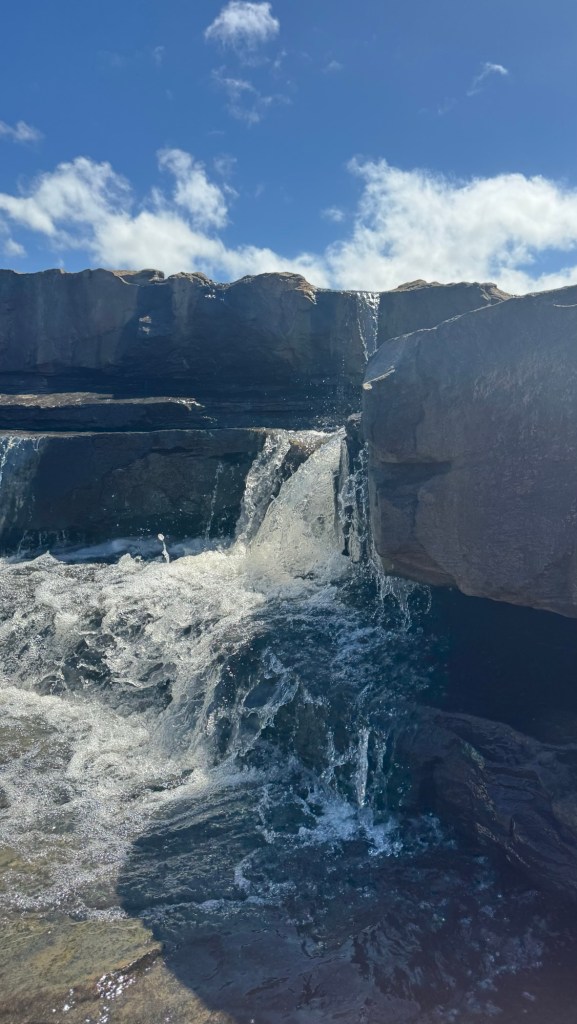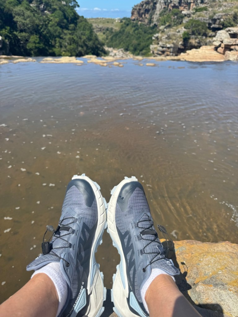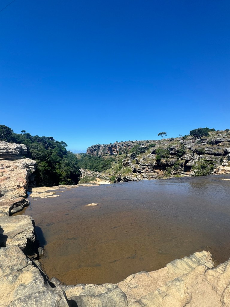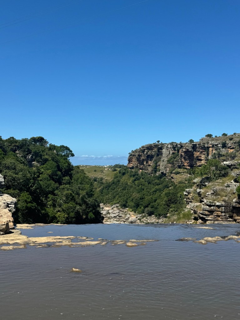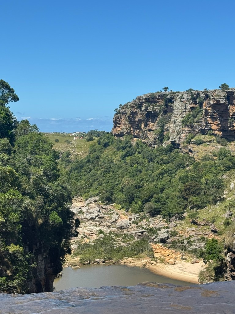 I had bought new hiking boots in Umhlanga, so I was able to break them in on this trip. We finally reached the gorge after an hour’s drive or so down the twisting, turning dirt road leading in. There was no one in sight. There was no entrance fee or park ranger. We just parked on the side of the road and each got out to go explore. The gorge was deep and my fear of heights kicked in quickly. I stood a ways back from the edge, but did my best to capture the vastness. I also walked out across the waterfalls that were a bit lower than usual despite the rain. That gave me a great vantage point.