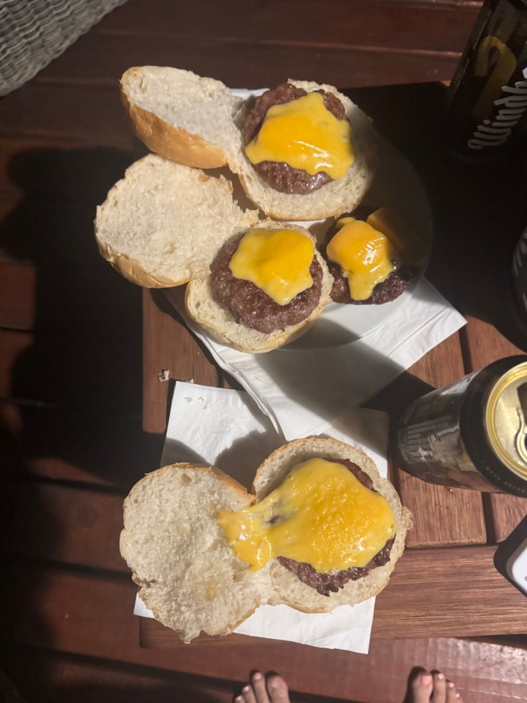 We bought beers and my favorite shots and had happy hour out on the deck overlooking the sea at our campgrounds. We braaied on the back deck or our cabin building delicious burgers. I introduced Walter to s’mores using chocolatey cookies and vanilla custard marshmallows. (The cookie game is not great in this country.)