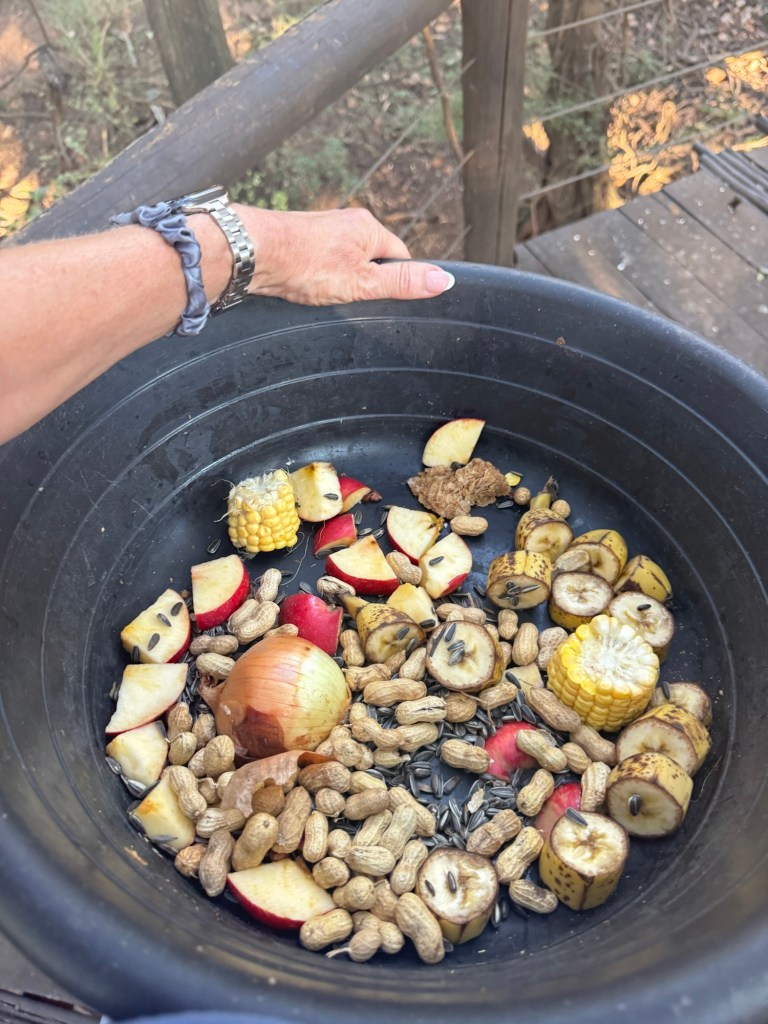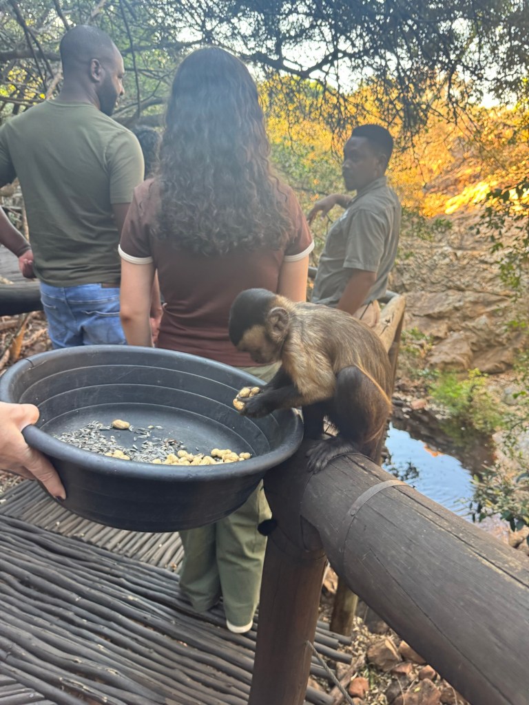 You walk freely through the forest and several of us held big bowls of food. Just seconds after the guide handed me my bowl, a monkey hopped onto me, climbed up me and chose something from my bowl! A little later, one jumped down from a tree onto me and ate from my bowl.