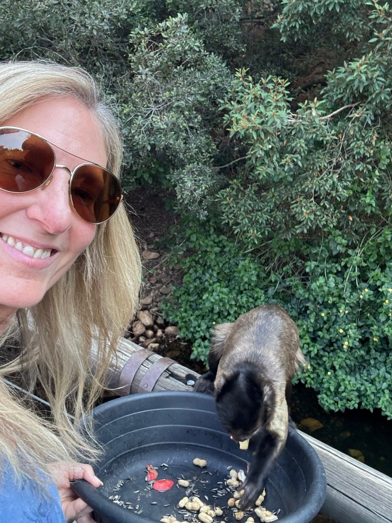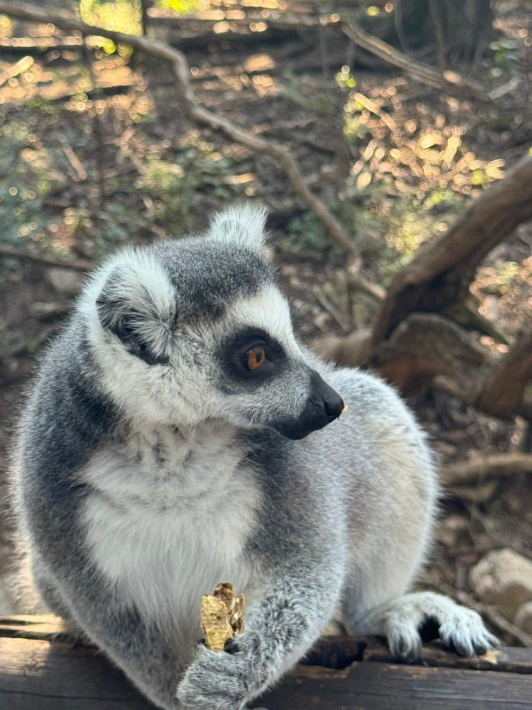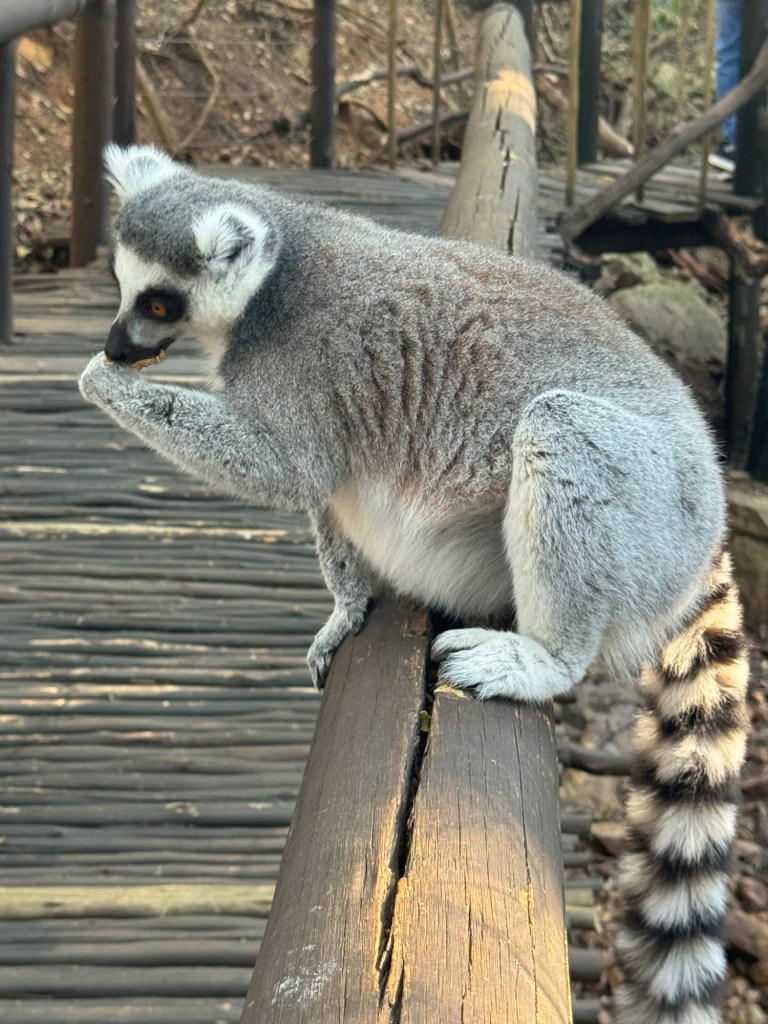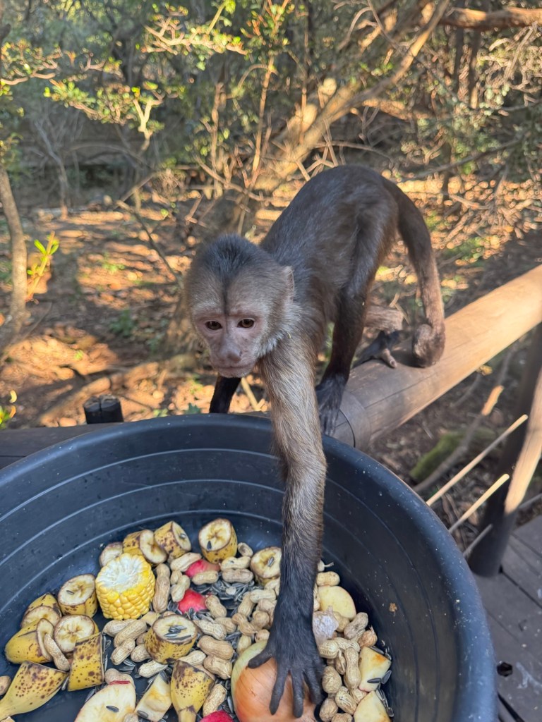 It was so interesting to see the many different personalities amongst the monkeys and how amazing their balance is. I loved when they would grab food in both hands and walk on just their hind legs down the rail! They also use tools to break apart the food.